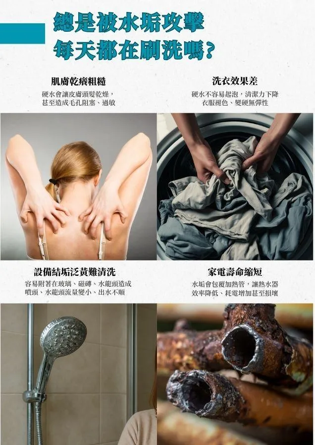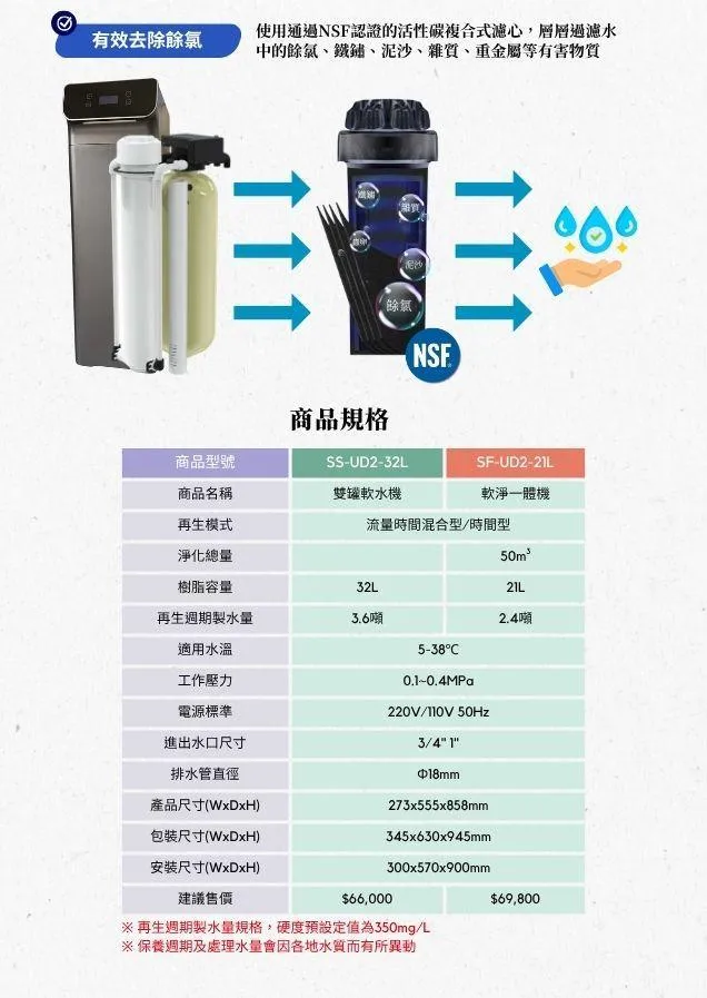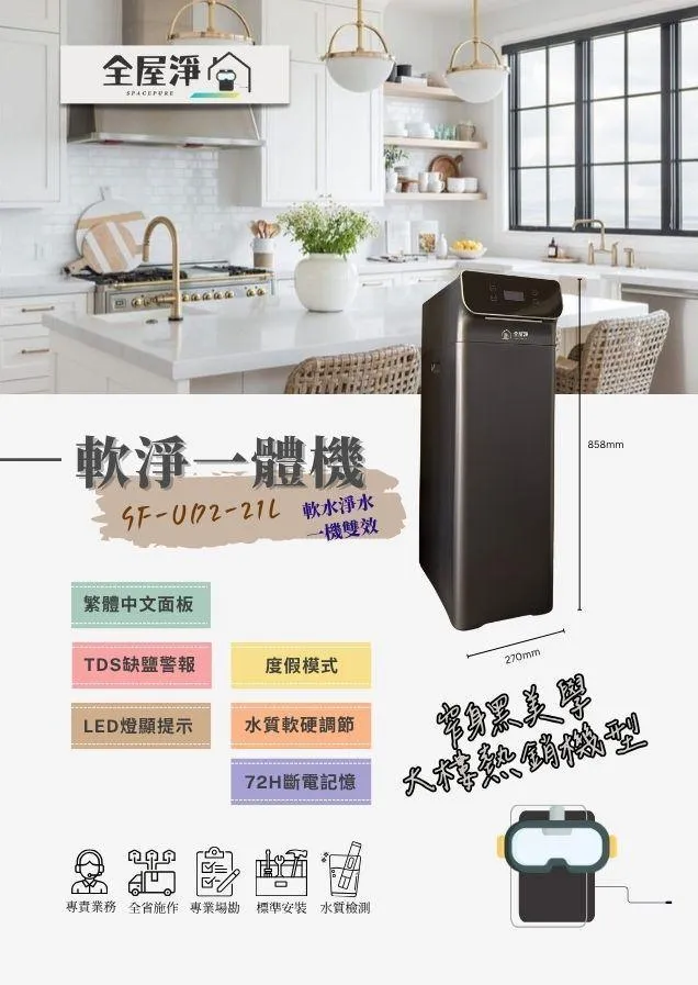 軟水讓洗澡、洗衣、清潔更舒服;淨水讓每一滴進入家中的水都更安全、潔淨、無雜味除餘氯。