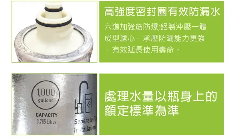 額定總淨水量:1000 Gal(約 3785 L)